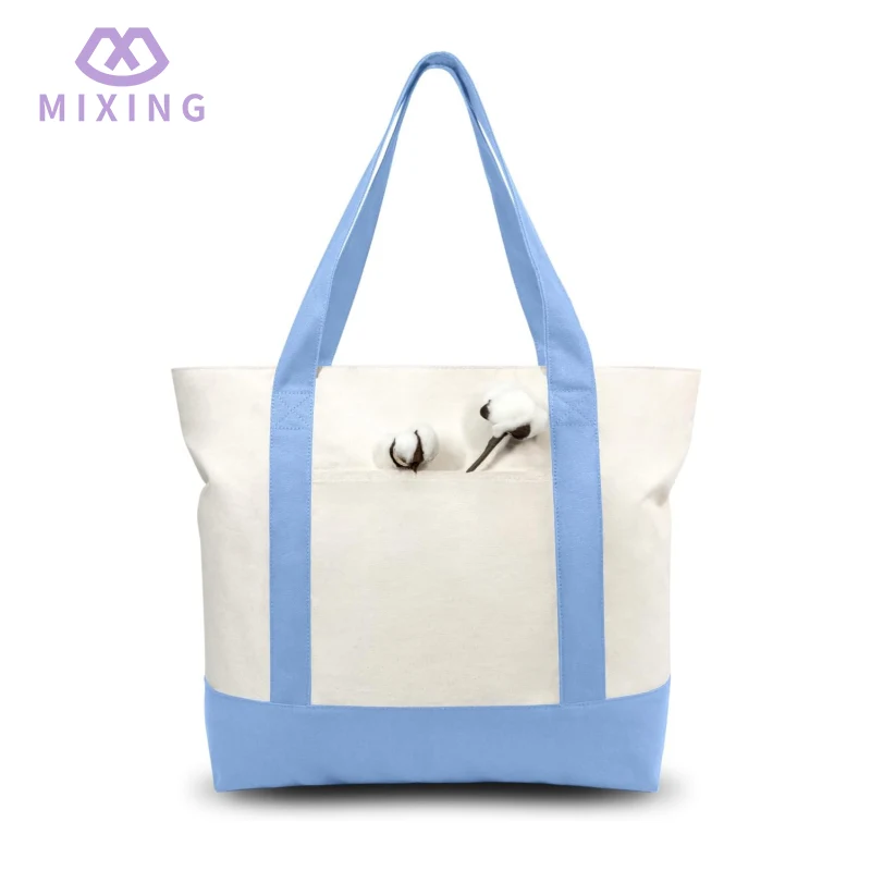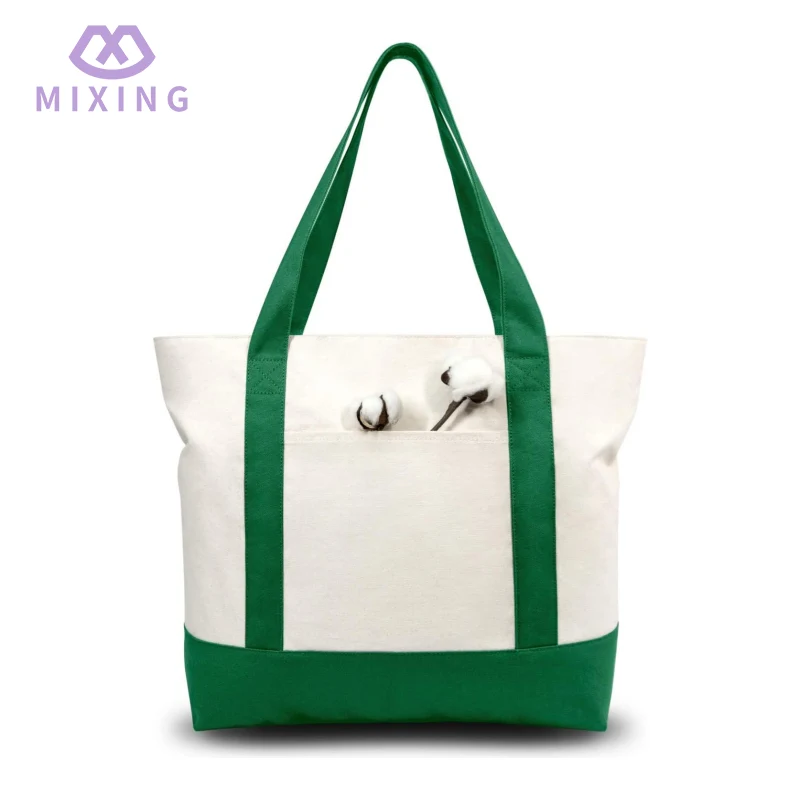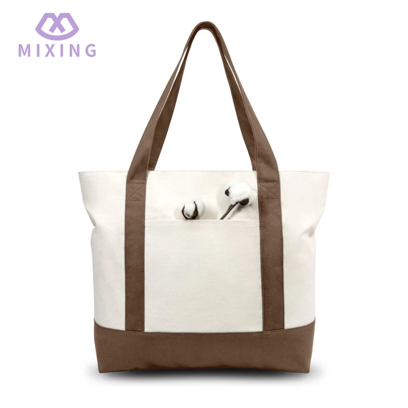 ミキシングの外ポケット付きチャイナキャンバストートバッグは、厚手の帆布素材でありながらかさばらず、物を入れた後もしっかりとした形を保てます。数冊の本やペットボトルを入れてもバッグ本体は中の物を変形させることなく安定して保持できます。